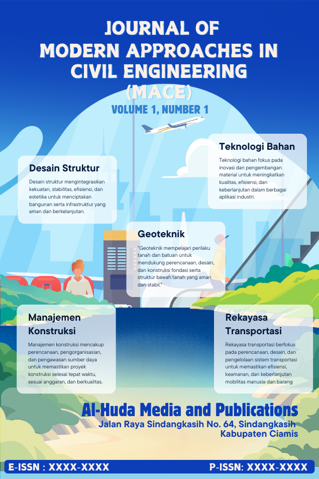 Modern Approaches in Civil Engineering (MACE) adalah jurnal ilmiah yang berfokus pada publikasi artikel berkualitas tinggi di bidang teknik sipil. Jurnal ini mencakup berbagai topik, termasuk desain struktur, teknologi bahan, manajemen konstruksi, geoteknik, rekayasa transportasi, dan inovasi berkelanjutan dalam teknik sipil. Dengan pendekatan multidisiplin, MACE bertujuan untuk menjembatani kesenjangan antara penelitian akademis dan aplikasi praktis, memberikan kontribusi signifikan bagi pengembangan teknologi dan metodologi modern dalam industri teknik sipil. Jurnal ini dirancang untuk akademisi, peneliti, insinyur, dan profesional di seluruh dunia.